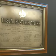 (ADDENDUM: There were actually two different dedication plaques on the bridge over the course of the series. The first was made by Jeff Clark of the Paramount Sign Department. The second was made by the good people at the Franklin Mint. The plaques had different designs, but both indicated the same stardate for the ship’s launch. The photo below shows the second version of the plaque, which features the names of numerous Starfleet personnel who presumably built the ship, but are actually production personnel responsible for Star Trek: The Next Generation, including series creator Gene Roddenberry and legendary modelmaker Gregory Jein.)